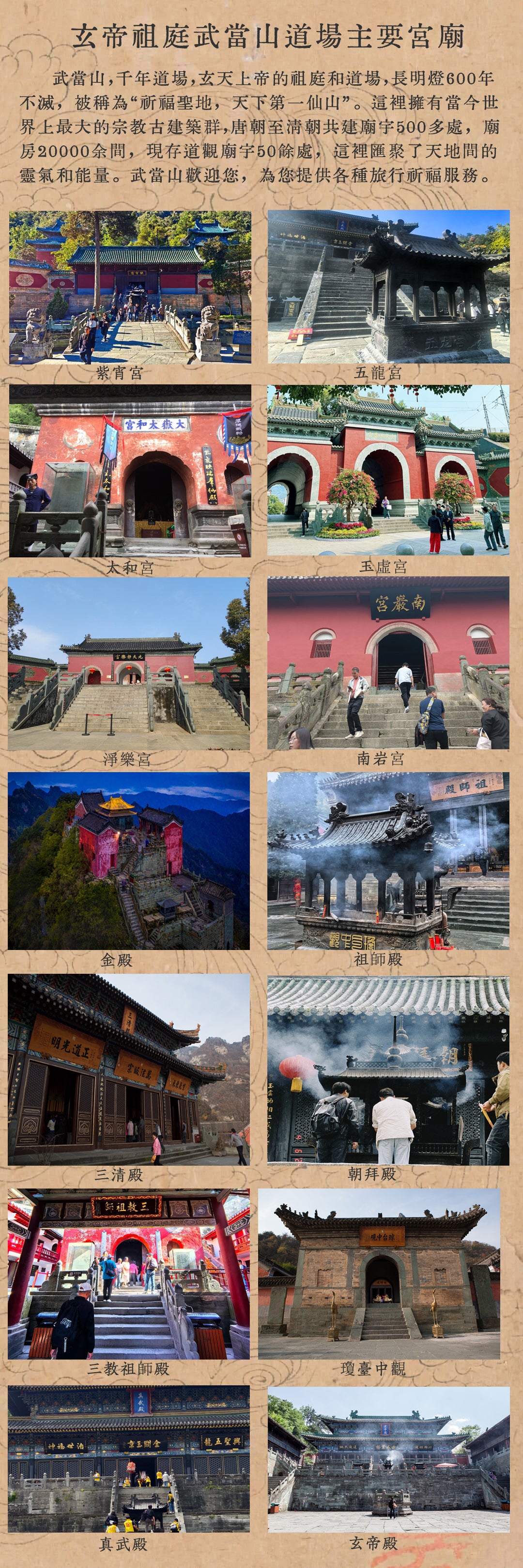 武當山,六百年皇家道場,1994年被聯合國列為世界文化遺產,這裡彙聚了天地間的靈氣和能量。現存有金頂、紫霄宮、太和宮、玉虛宮、南岩宮、瓊台觀、五龍宮、淨樂宮等道觀廟宇50餘處,其中,位於海拔1612米頂峰的金頂,是以20噸精銅鑄造,及耗費黃金360公斤,歷經600年風雨仍金光璀璨,長明燈六百年不滅。